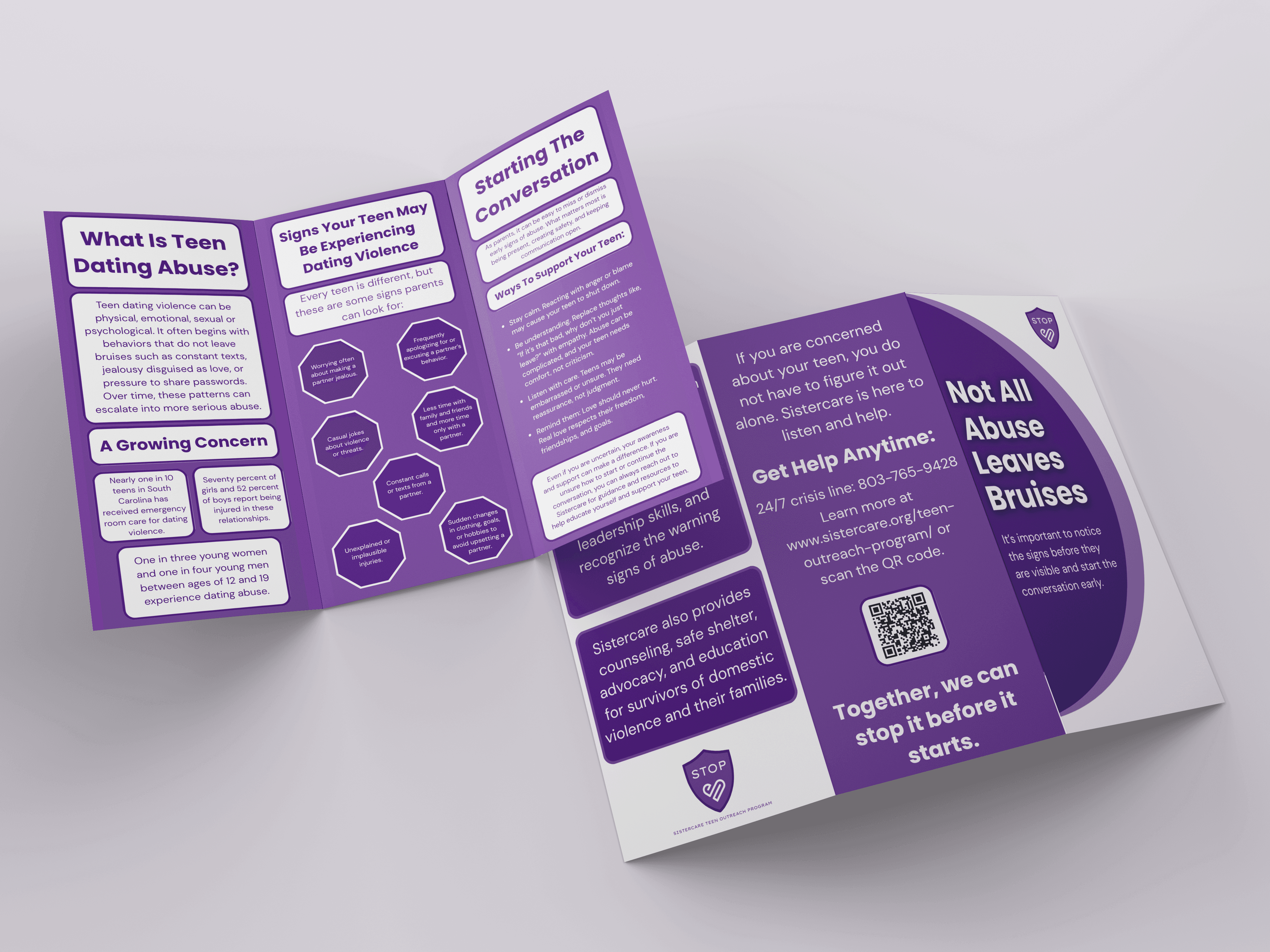 The Carolina Agency developed a comprehensive marketing strategy for Sistercare, concentrating on community engagement, awareness building, and rebranding. Our team created a new brand kit for the Sistercare Teen Outreach Program (STOP), featuring updated visuals, colors, and typography to modernize the program’s identity. Through these processes and efforts, TCA continues to help Sistercare boost its message, engage new audiences, and further its mission of empowering survivors and preventing domestic violence.